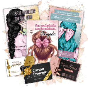 São vários modelos de arquivos digitais para cartões fidelidade, mimos, cartões presente, catálogos, mini sites e cartões digitais. Tudo para profissionais da beleza.